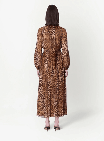 animal-print midi-dress from CAROLINA HERRERA featuring brown, animal print, stand-up collar, gathered neckline, cut-out detailing, elasticated drawstring waistband, long puff sleeves, elasticated cuffs, rear tie fastening and flared skirt.