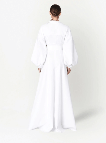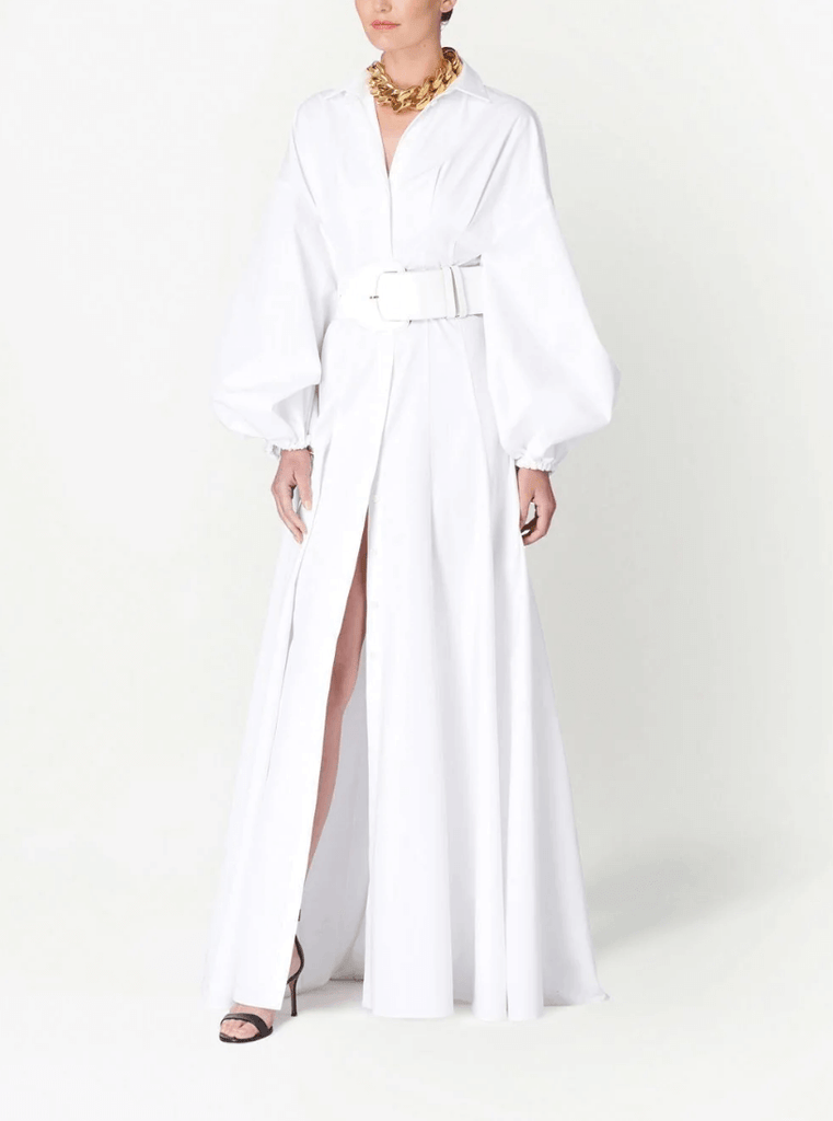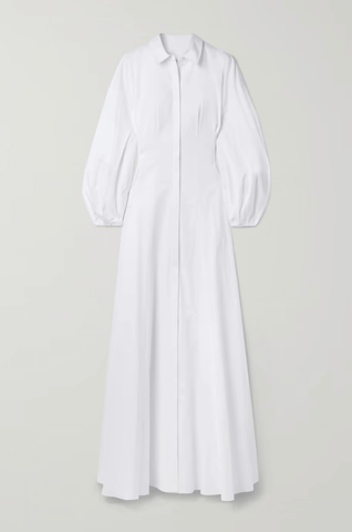 Carolina Herrera's gown is an elegant take on the traditionally smart-casual shirt dress. Made from white cotton-poplin, it has billowy sleeves and a floaty skirt tempered by a nipped-in waist. Undo a few buttons at the hem to create a more dramatic split.