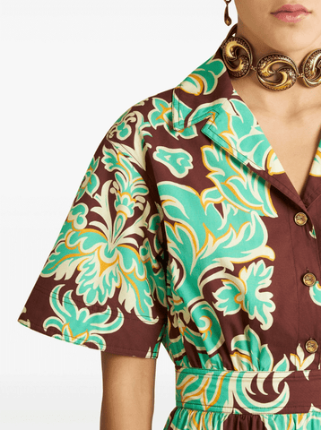 Bold patterns and colours are pillars of ETRO's joyous aesthetic, and this shirtdress is exemplary. Crafted from cotton to an A-line silhouette, it is saturated with the brand's ornate Venus print, combining shades of green, brown and yellow. It is finished with signature Pegaso buttons and embroidery.