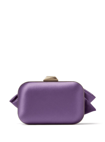 Cloud bow-detail clutch bag from JIMMY CHOO featuring lilac purple, satin finish, bow detailing, detachable chain-link shoulder strap, clasp fastening, engraved logo and main compartment.