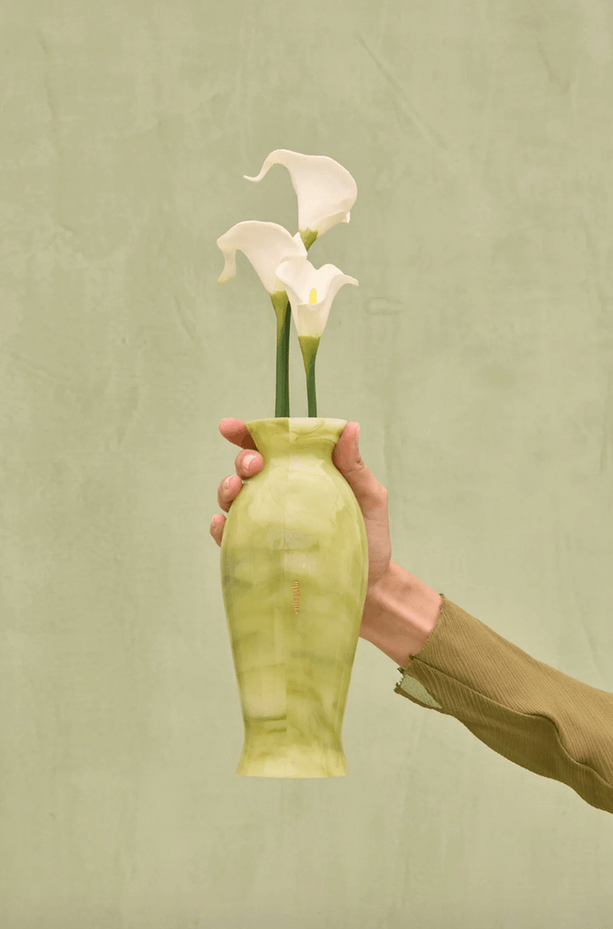 A marbled acrylic vase of calla lilies that opens for storage and functions as wearable art. Handmade with love, each Calla flower is unique.