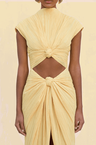A plisse midi dress featuring a flattering chest cutout and a mock neckline.