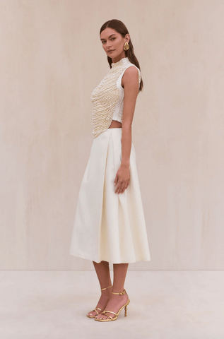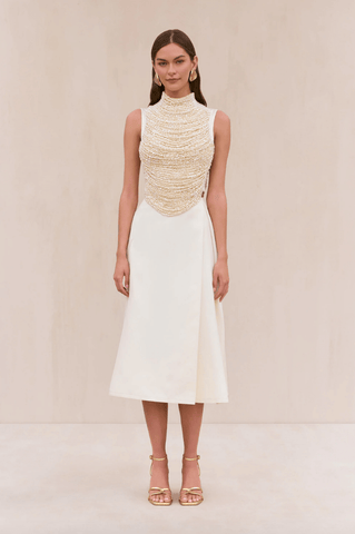 An artisanal top rendered in hand beaded faux pearl arcs over a mesh underlayer.