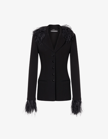 Single-breasted, eco-sustainable organza jacket with a more fitted silhouette at the waist. Light tone-on-tone feathers float on the lapels and sleeve cuffs, adding a special touch to the garment.