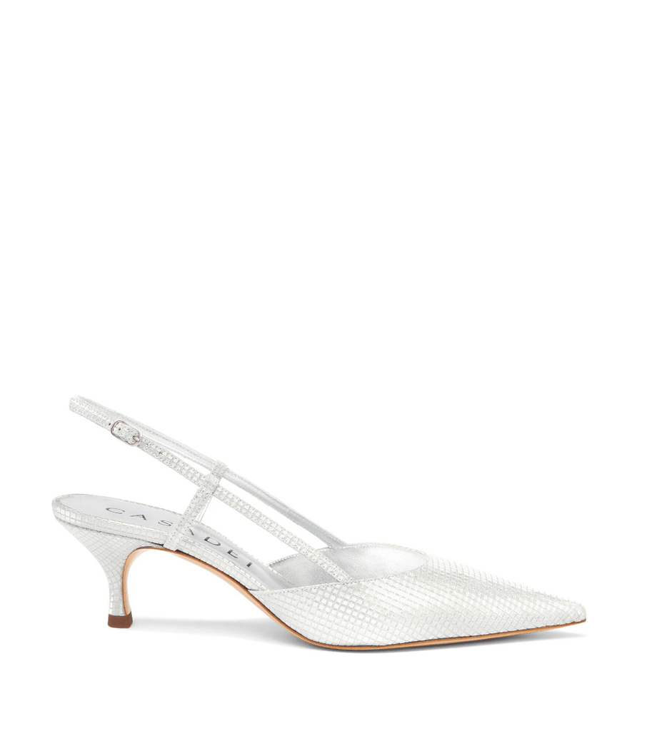 "Shine" is the watchword. Casadei's Diadema slingaback lives in its own light thanks to the reflectivity of the silver metallised fabric. On a kitten heel, this elegant chanel guarantees a sparkling effect from every angle.