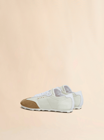 Low-top sneaker inspired by retro soccer styles, made from nylon with suede and nappa leather overlays. Designed to offer slipper-like comfort with a flexible rubber outsole and deconstructed, unlined upper. Made in Italy
