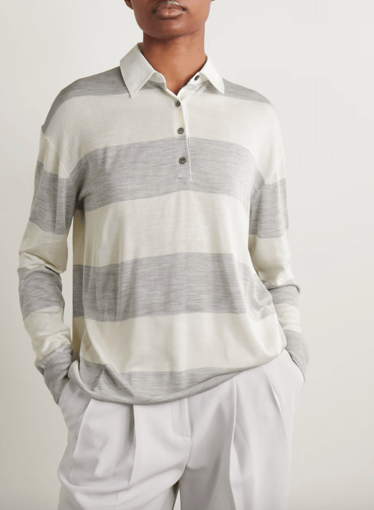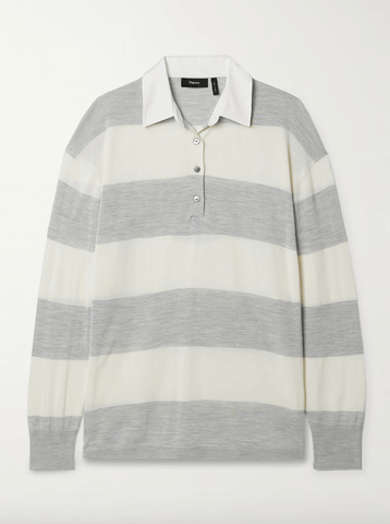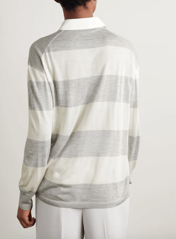 Inspired by traditional rugby styles, Theory's shirt is knitted with wide stripes alternating from cream to light-gray. It has a contrasting collar and fastens with lustrous buttons along the half-placket. Keep it casual with jeans and sneakers.