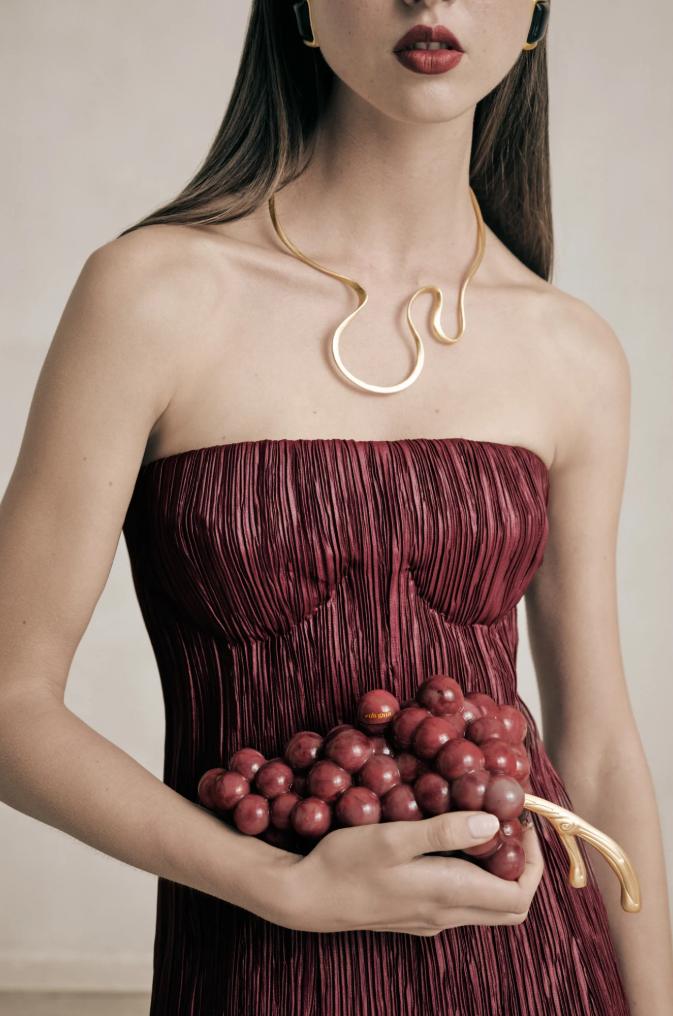 Grape Clutch - A delicate acrylic clutch with a brass stem that forms a cluster of grapes that opens on a hinge for storage.